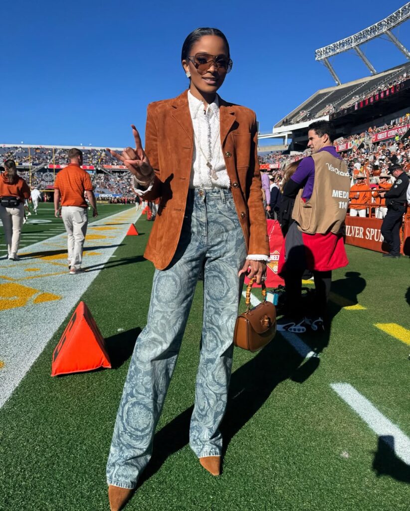 Loreal’s “sideline style” is a masterclass in branding. She frequently incorporates Texas Longhorn “Burnt Orange” into high-fashion ensembles featuring brands like Chanel, Gucci, and Balmain.
